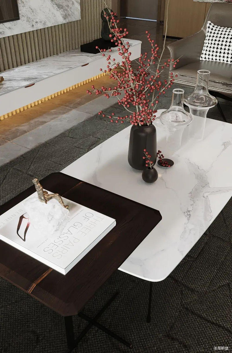 純美的線條,沉穩(wěn)的色澤,為空間定下了低調(diào)而華麗的基調(diào)。渾然天成的實木與巖板紋理,讓角幾蕩漾出一幅“水光瀲滟”的潑墨油畫。三兩紅枝點綴,表達著“枝頭并蒂祝吉祥”的美好祝愿。光影透過極簡金屬幾腳,折射出一種隱藏的優(yōu)雅氣質(zhì)。大小、高低不一的天然材質(zhì)角幾組合在一起,時尚又個性,不僅便于移動,還表現(xiàn)的靈活且輕巧。