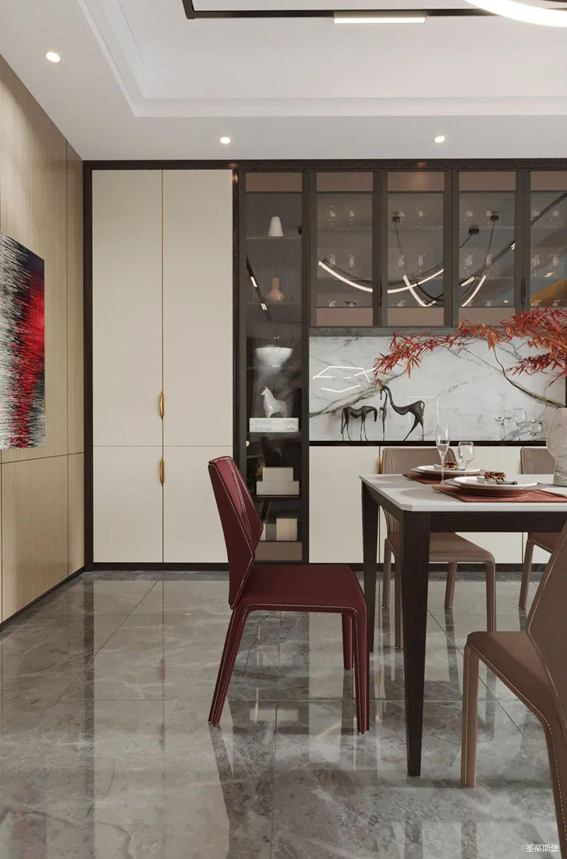 一字型布局的開放空間,強化了餐廚的開闊感,延伸了空間的舒朗視野。純白調(diào)的天然餐桌,與周圍空間融為一體,映襯著空間的純潔美好。意式簡約的紅色餐椅,線條簡潔凌厲到能輕易征服人心,一隅紅楓點綴其中,視覺層次感瞬間得到提升,讓人于靜簡和清歡之間,感受人生百味。