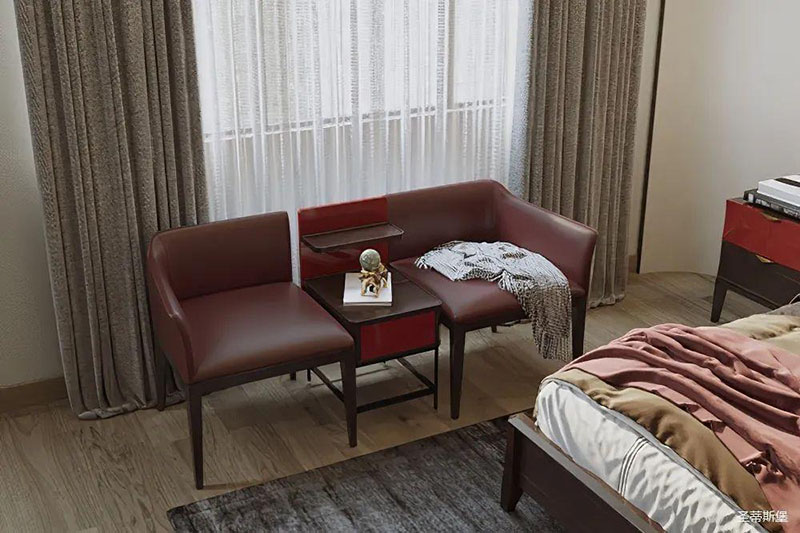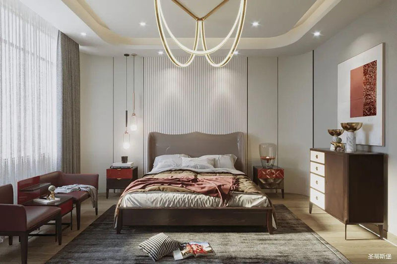 靈活變裝的主臥空間,自成獨特的設(shè)計語言與真摯的感情糅合。經(jīng)典意式極簡軟床,流暢順滑的真皮床屏,賦予了空間溫馨高貴的氣息。酒紅實木質(zhì)感的床頭柜,整齊擺放,欲有“鴻運當頭”的美好寓意,塑造出一方簡約知性的靈動空間。