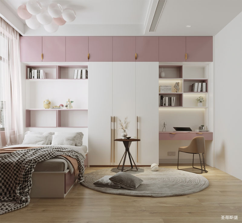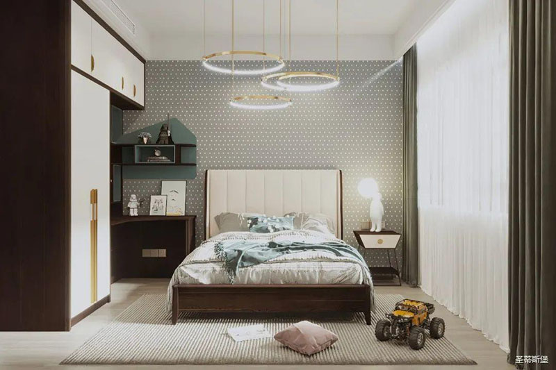 桌柜一體接壤設(shè)計,絢麗與沉穩(wěn)相互襯托,足以達到空間最好的狀態(tài)。飽和又柔潤的色塊,整齊坐落于床體柜身,通過極簡規(guī)劃分配,刻畫出完美的實木紋理。造型獨特的床前燈,像一抹陽光照進心扉,散發(fā)著童真與夢幻的味道,形成了獨有的輕奢精致感。