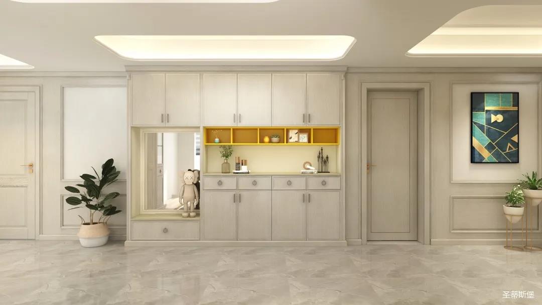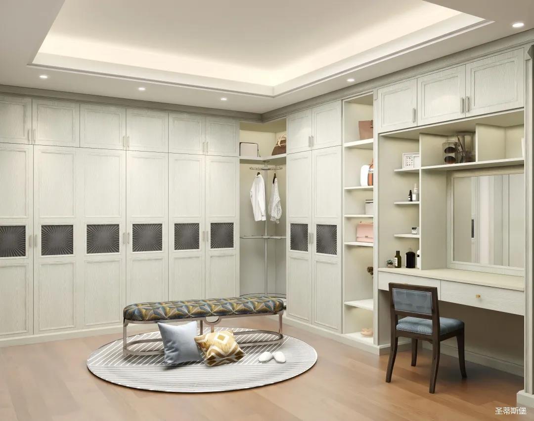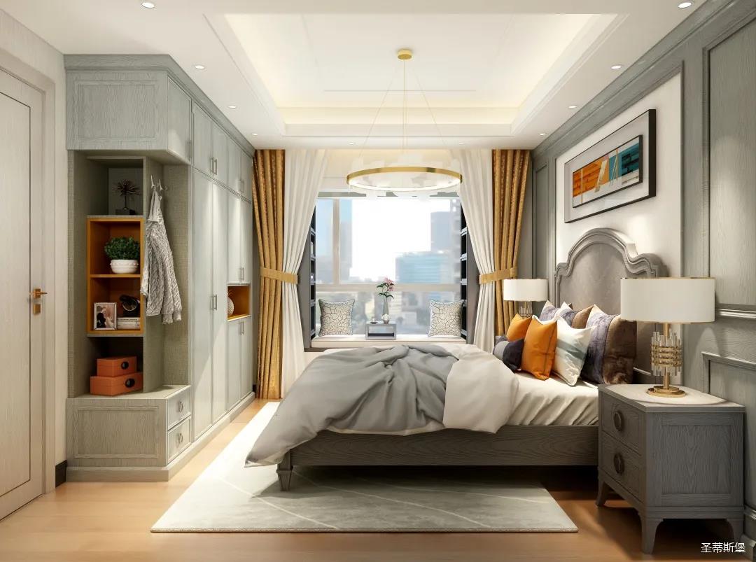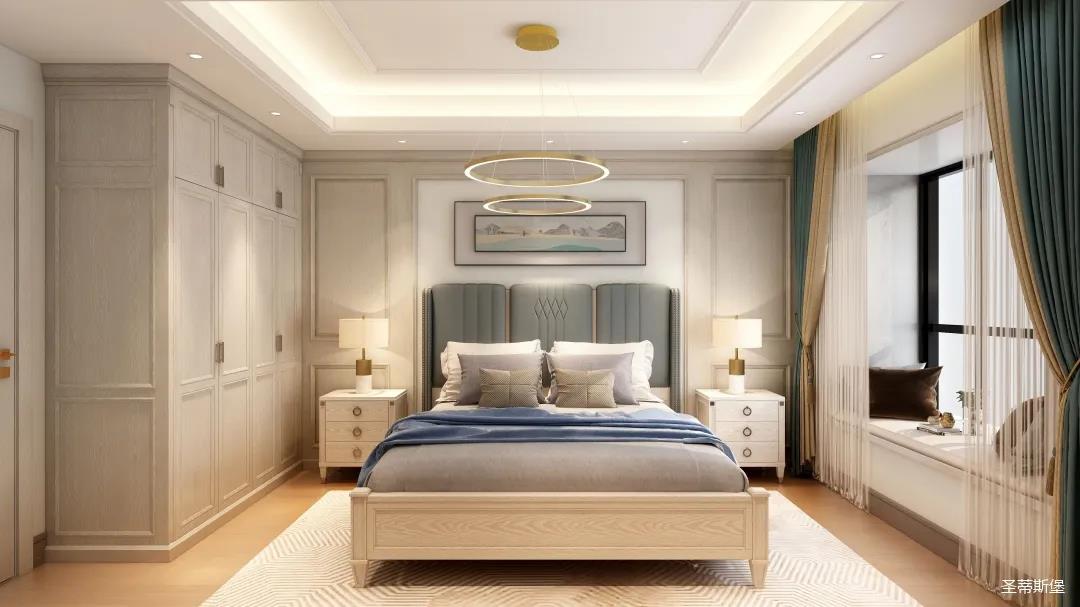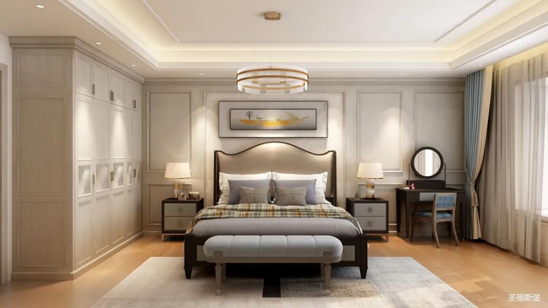 ▲業(yè)主喜歡低調(diào)輕奢的空間格調(diào),設計師從功能出發(fā),賦予空間舒適的感受,打造專屬的衣帽間,滿足業(yè)主日常買買買的儲物喜好。同時也將藝術元素融入美式現(xiàn)代風格,利用空間的色彩、紋理、家具、配飾、光線等表達空間情緒,再以黃銅金屬加持,營造溫馨愜意的家居睡眠氛圍。