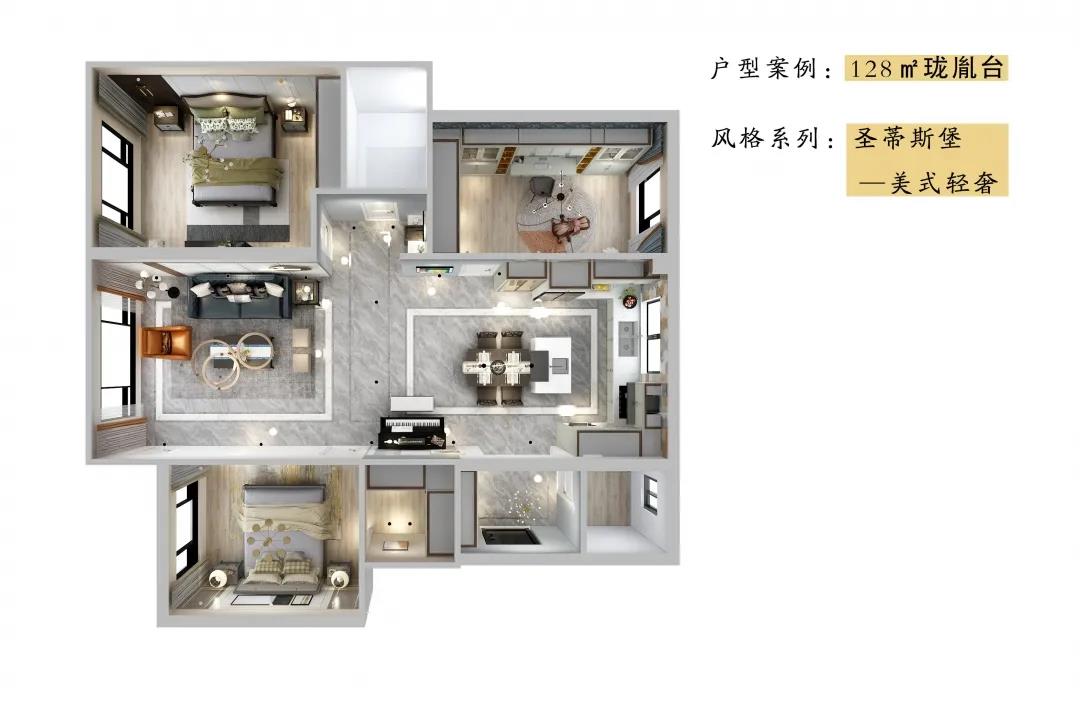客廳延續(xù)著美式輕奢的氣韻,背景墻被簡約有序的金屬線條分割,營造出質(zhì)感空間的細膩。沙發(fā)沉穩(wěn)又不失時尚,色彩混搭更是讓人耳目一新,展現(xiàn)著美式風格天性自由不羈的浪漫個性。