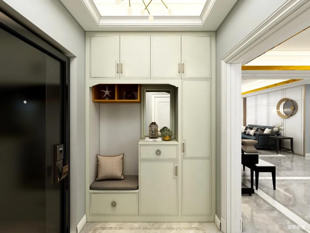 象牙白色調(diào)讓入室空間散發(fā)著溫柔的氣息,定制玄關柜上輕奢金屬線條的加持,洋溢著一種不加雕飾的美感,色澤素雅,紋理精致,于內(nèi)斂沉靜中,感受入戶空間的氣質(zhì)。