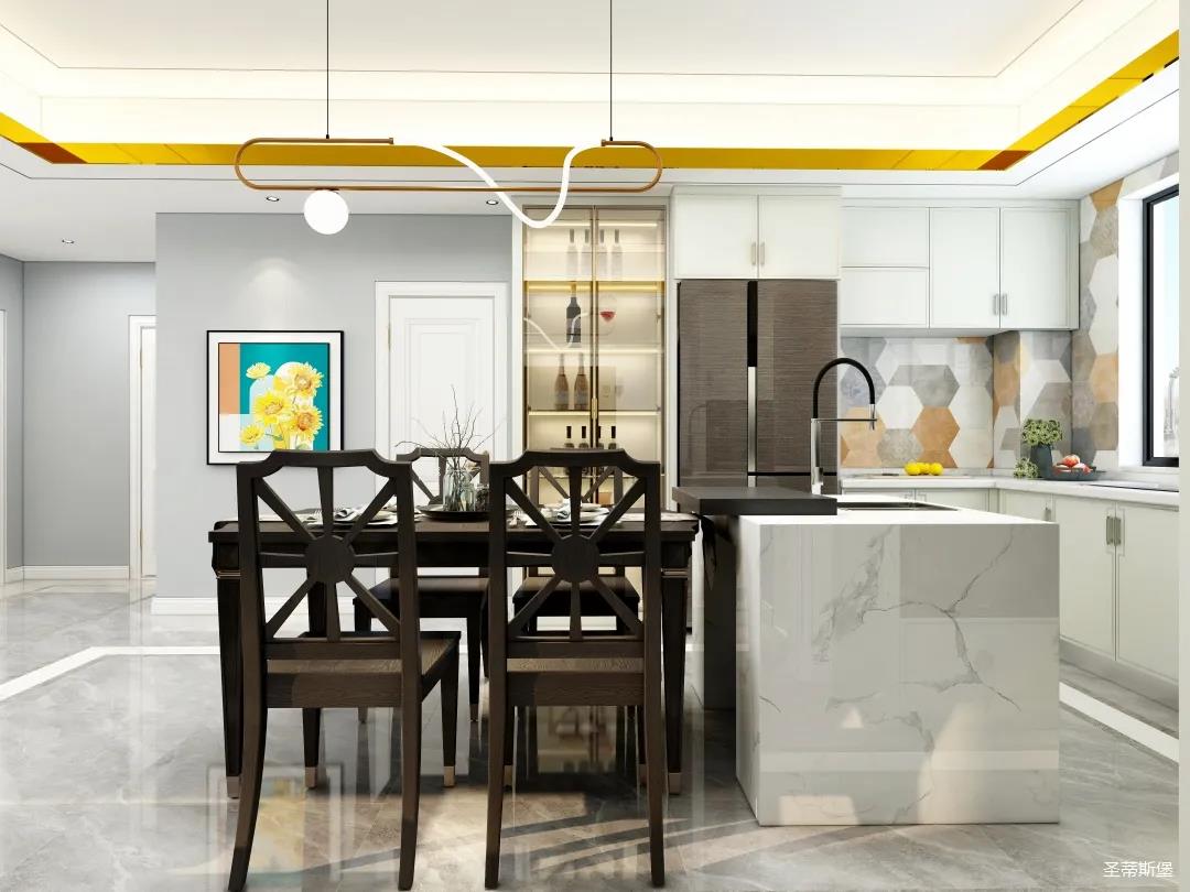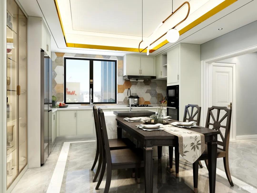 儀式感的餐廚空間,應在自然光影中跳躍。從設計搭配細節(jié)將美式開放,不設限的特性顯現(xiàn),實木餐桌線條簡約且剛毅,中島臺鏈接起用餐空間的隨性,不遺余力的拉伸空間的層次感。